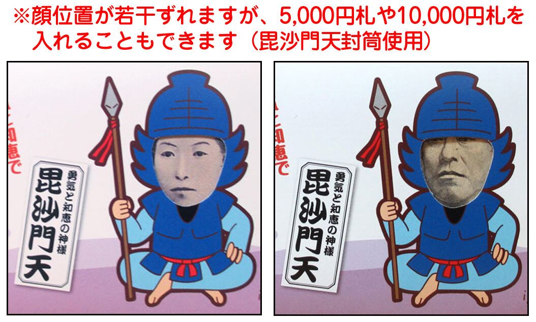 封筒に穴が開いており、1,000円札を入れると七福神の顔の位置に野口英世の顔がひょっこりのぞきます。